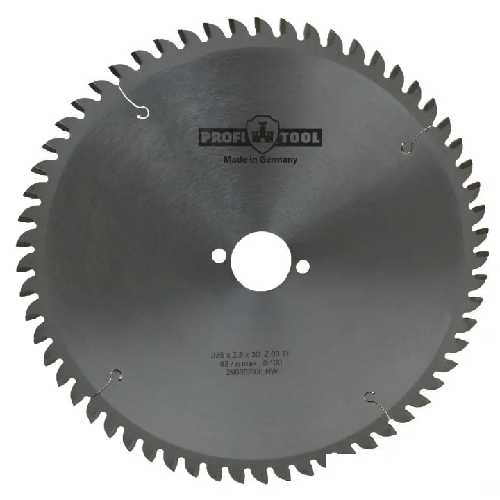 Артикул Діаметр, мм Ширина різання мм Товщина диска, мм Посадка, мм Кількість зубців, шт Форма зубця Бокові отвори 2116015 160 2,8 2,2 20 42 TF 2/5,3/32 2119013 190 2,8 2,2 30 54 TF 2/7/42 2121006 210 2,8 2,2 30 54 TF 2/7/42 2123502 235 2,8 2,2 30 60 TF 2/7/42 -