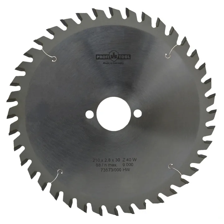 Артикул Діаметр, мм Ширина різання, мм Товщина диска, мм Посадка, мм Кількість зубців, шт Форма зубця Бокові отвори 2116013 160 2,6 1,6 20 36 W 2/5,3/32 2116009 160 2,2 1,4 20 40 W 2/5,3/32 2116502 165 2,6 1,6 30 36 W 2/7/42 2118405 184 2,2 1,4 30 40 W 2119004 190 2,2 1,4 30 40 W 2/7/42 2119012 190 2,8 1,8 30 40 W 2/7/42 2121004 210 2,8 1,8 30 40 W 2/7/42 -