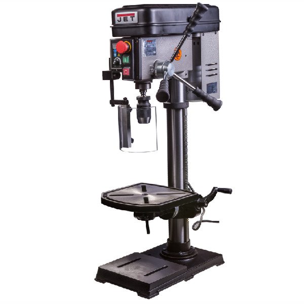 Підстава, стіл та голова верстата відлиті із сірого чавуну. Голова встановлена на товстостінні труби, що ефективно гасить вібрації. Стіл має можливість повороту в обидві сторони на 45 градусів, а також можливість підйому та опускання. Стіл обертається за годинниковою та проти годинникової стрілки навколо колони. Так, наприклад, максимальна відстань від шпинделя до столу складає 470 мм. Верстат підключається до звичайної побутової мережі 220В, встановлюється на верстат або підстілля, передбачена можливість кріплення через основу. На верстат поширюється фірмова гарантія JET. У комплект поставки входить дорн, патрон свердлильний від 1 до 13 мм.
