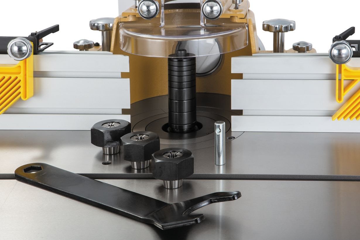 Усі необхідні налаштування виконуються швидко та точно. Механізм регулювання висоти шпинделя має цифрову індикацію. Переустановка поліклінового ременя для вибору частоти обертання проводиться без використання інструменту та займає мінімум часу. Фрезерний упор укомплектований довгими накладками («щоками»), які мають індивідуальне налаштування по вильоту та корекцію по куту (гвинти для тонкого підстроювання паралельності). Безпосередньо на накладках кріпляться вертикальні притиски-гребінки. У корпус упору вбудований 100-міліметровий штуцер для підключення до системи пиловідсмоктувача.