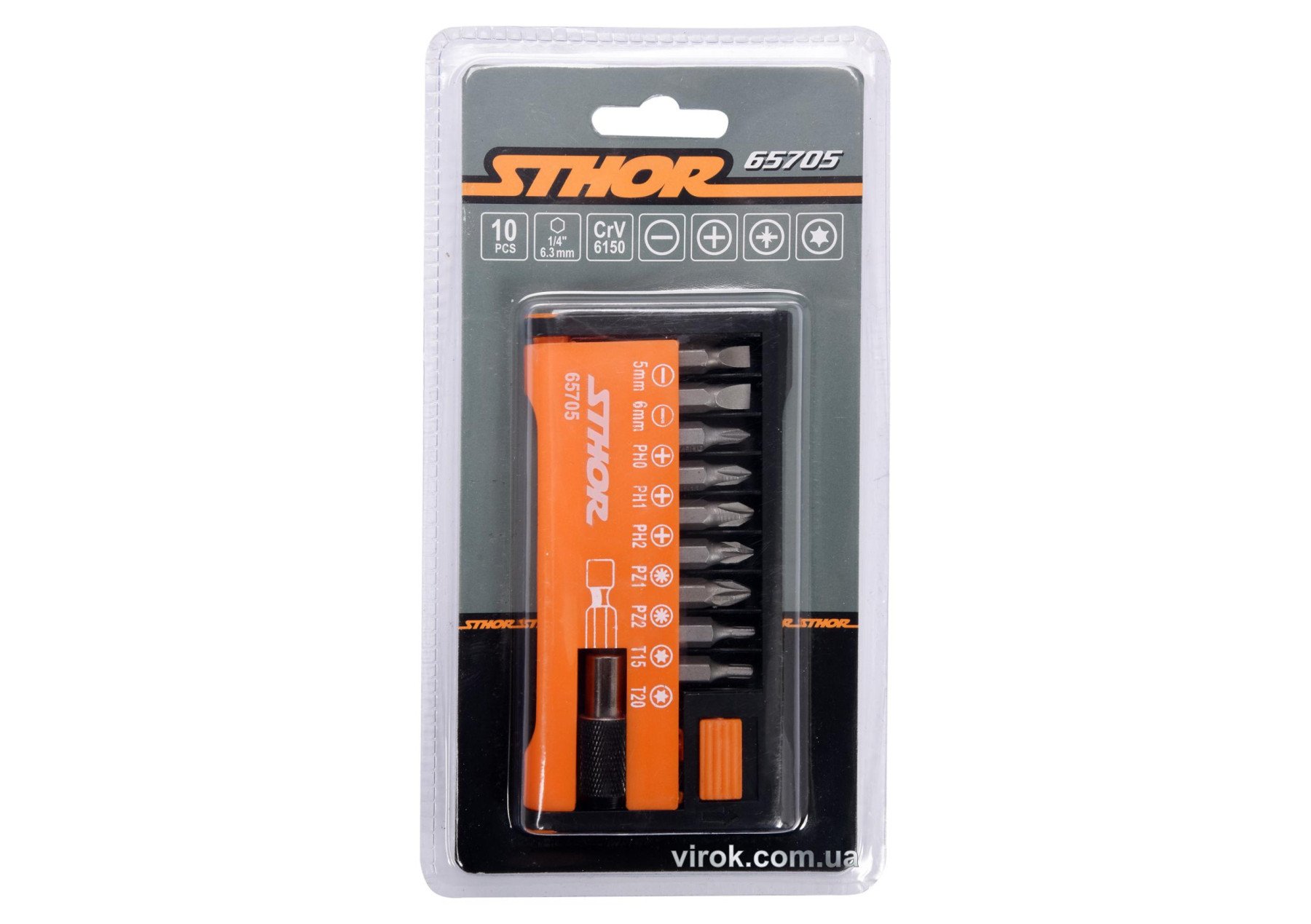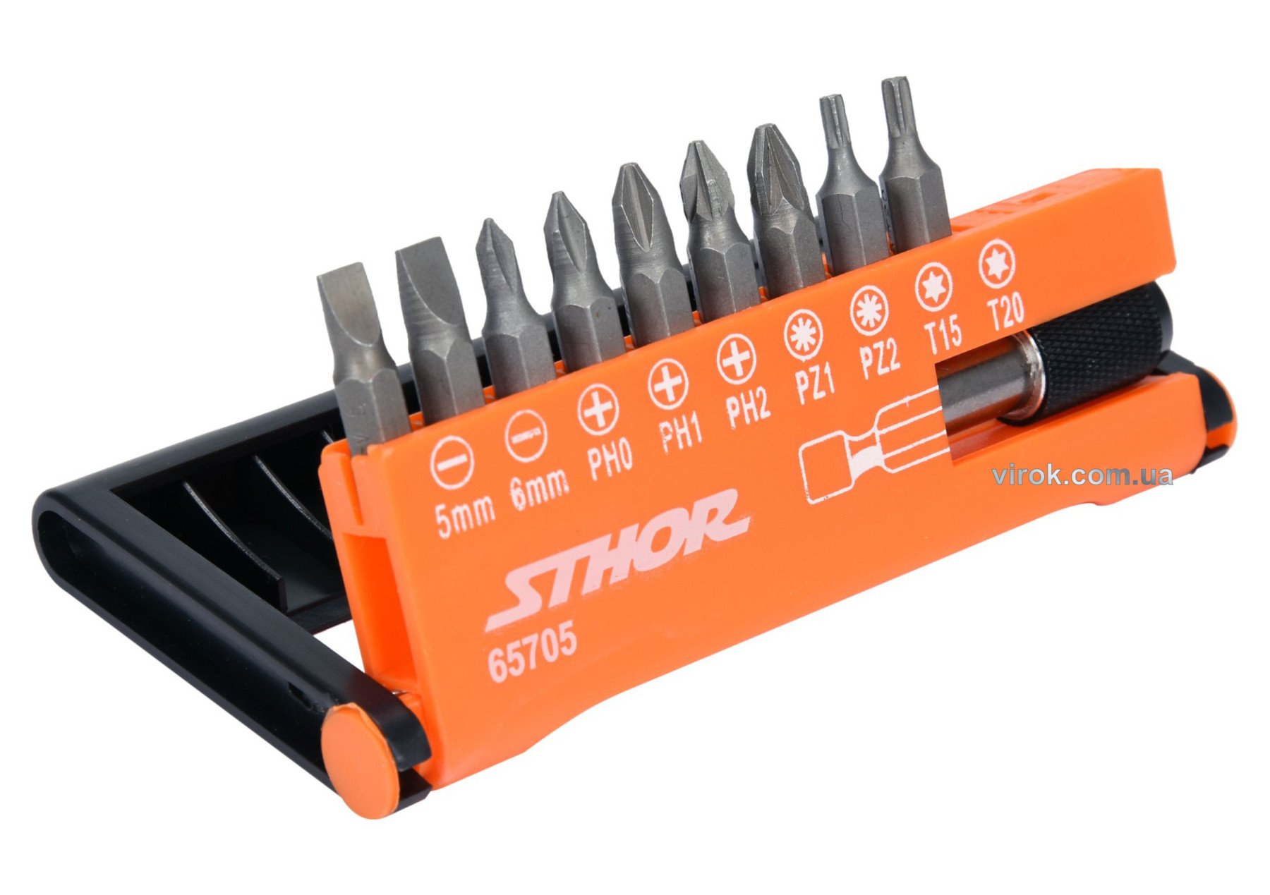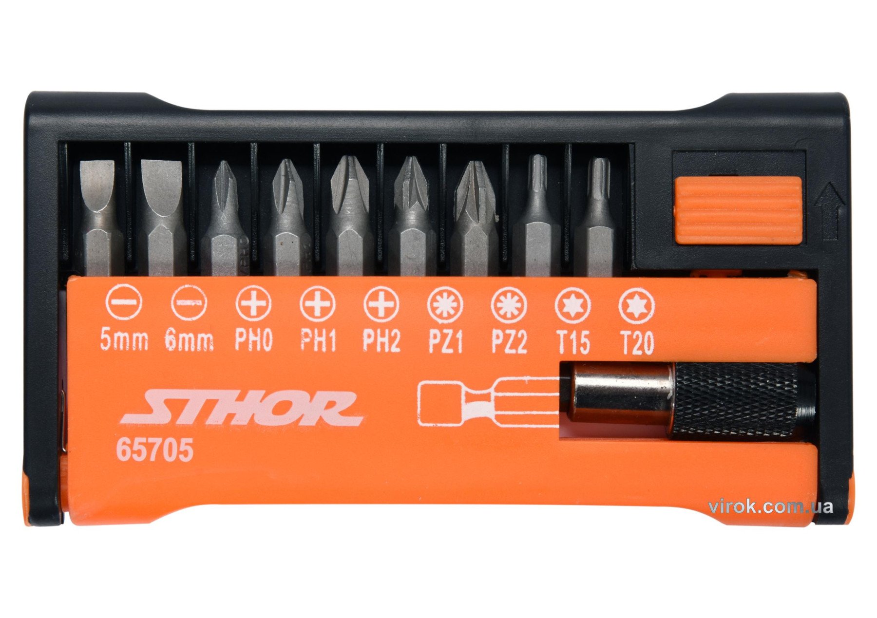 Набір викруткових насадок STHOR 65705 поставляється в практичній упаковці з розбірливим маркуванням типів насадок.