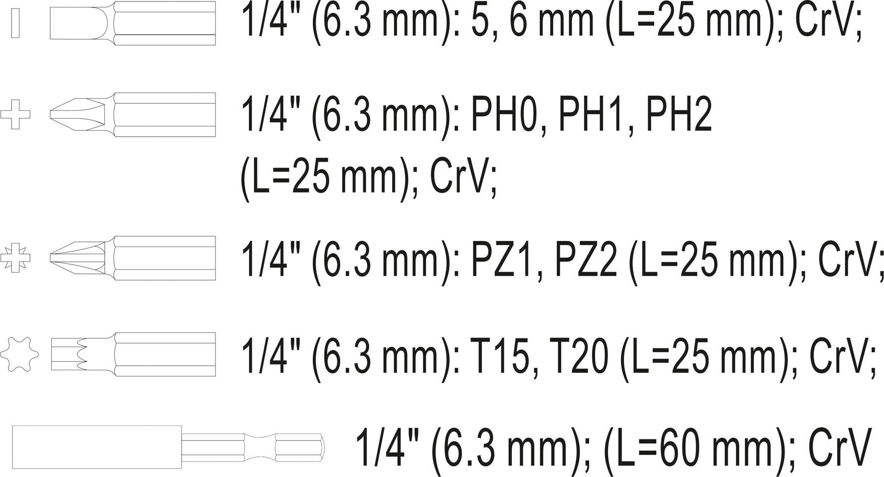- Хрестові викруткові насадки (Біти) PH 1/4': PH0, PH1, PH2 (25 мм)