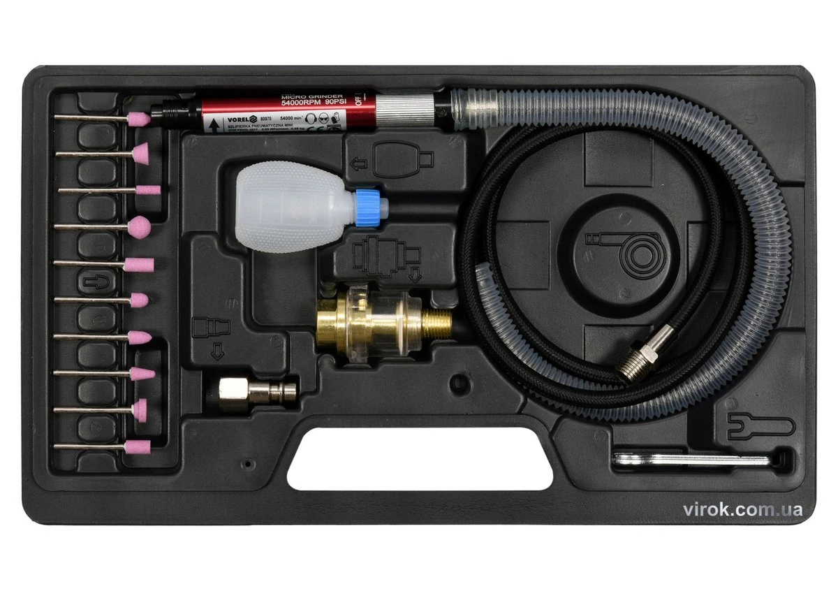 VOREL Шліфмашина пневматична міні, при тиску- 0,63 MPa, сопло Ø=3 мм, з насадками, 16 елем. | 80970