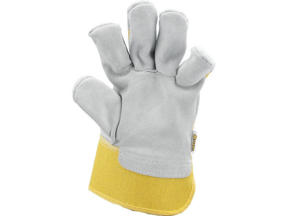 Міцні будівельні рукавички з товстого коров'ячого шортенінгу та бавовняного трикотажу. Вони виявляться особливо корисними для важких будівельних робіт, у саду та там, де не потрібне високоточне захоплення. рукоятка: натуральна шкіра верх: натуральна шкіра та бавовняний трикотаж манжет з ламінованого бавовняного трикотажу категорія захисту: I
