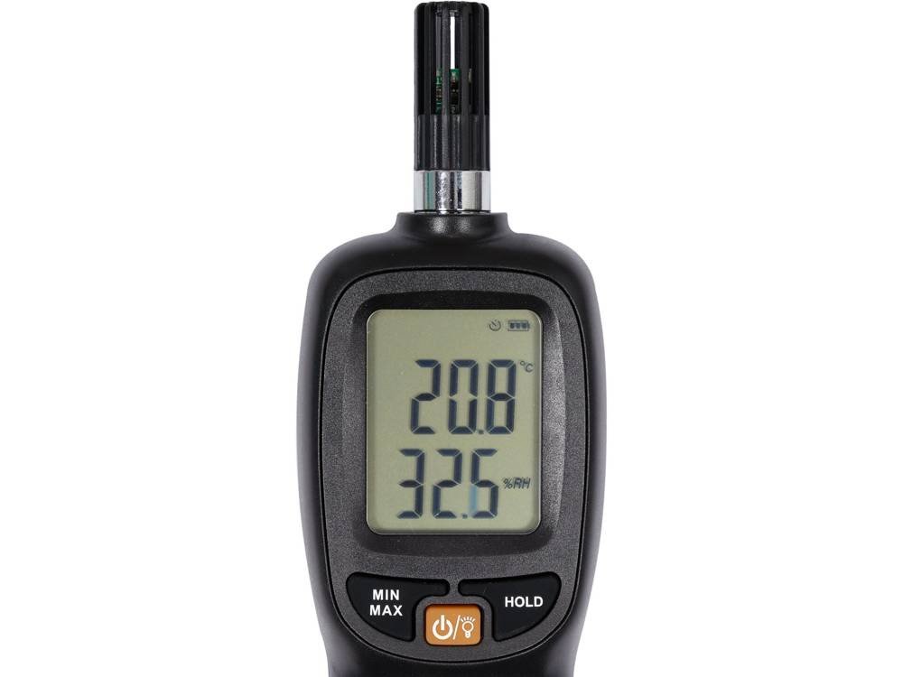 Вимірювач вологості і температури (гігрометр) — прилад для реєстрації рівня відносної вологості повітря і температури навколишнього середовища. Удосконалений датчик виконує мінімум 65 вимірювань за секунду. Мікропроцесор приймає вимірювальні сигнали, перетворює їх у середнє значення та відображає на екрані з оновленням кожні півсекунди. Портативний гігрометр широко використовується в повсякденній роботі. Використовується для контролю параметрів у сільськогосподарському виробництві, тваринництві, системах вентиляції, тераріумах тощо. Датчик контролює як відносну вологість, так і температуру. На основі цих показань мікропроцесор здатний розрахувати точку роси і т.зв температура по вологому термометру. Просте управління, великі цифри на дисплеї, ряд функцій, що полегшують роботу, і профільований корпус, який ідеально лежить в руці, роблять роботу з цим лічильником легкою і приємною. Точка роси: після вибору функції °C DP лічильник на основі вимірювань постійно розраховує точку роси, тобто температуру, при якій може початися процес зрідження газу. Температура за вологим термометром: після вибору функції °C WB вимірювальний прилад постійно обчислює значення цього показника на основі вимірювань. Робота за мокрого термометра вище 35°С небезпечна для здоров'я, може призвести до перегріву і, як наслідок, смерті. Кнопка Max/Min: фіксує найвище/найнижче значення поточного вимірювання на екрані Кнопка утримання даних: фіксує поточне значення вимірювання на екрані Автоматичне збереження даних: пристрій дозволяє автоматично зберігати 1000 вимірювань кожні 10 секунд Пристрій автоматично вимикається через 15 хвилин бездіяльності. Налаштування можна деактивувати при включенні пристрою. Технічні дані: частота оновлення екрану: 2 рази в секунду діапазон вимірювання відносної вологості %RH: 0-100% роздільна здатність: 0,1% RH точність: ±4% RH діапазон вимірювання температури навколишнього середовища: -20°C~70°C роздільна здатність: 0,1°C точність: ±1°C екран з підсвічуванням блок живлення: 3xAAA Гніздо для штатива 1/4'' розміри: 56*180*36 мм вага: 108 г (без батарейок)
