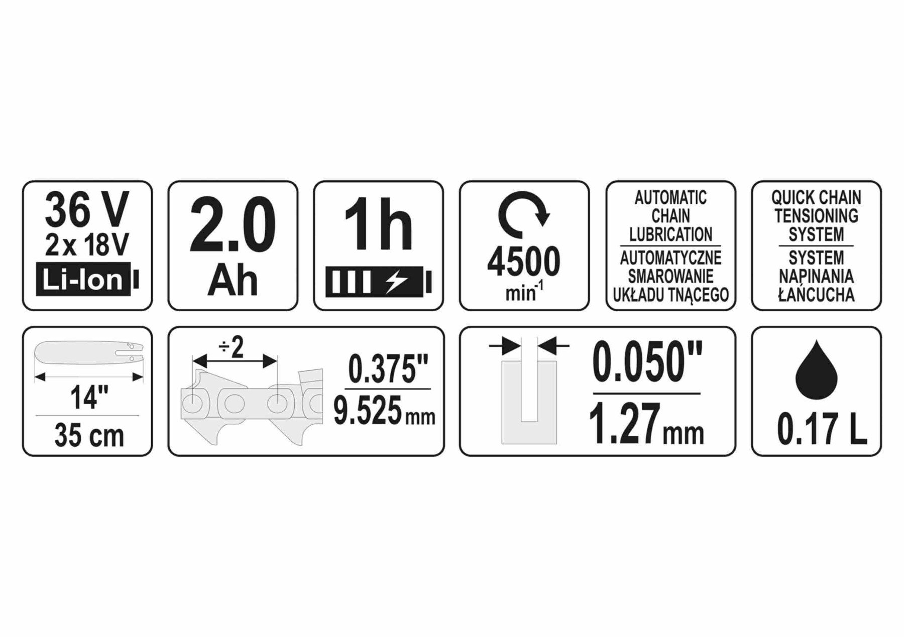 YATO Пила ланцюгова акумуляторна YATO : 36 В (2 x Li-Ion 18 В), 2 АГод, шина- 14"/35 см | YT-82812