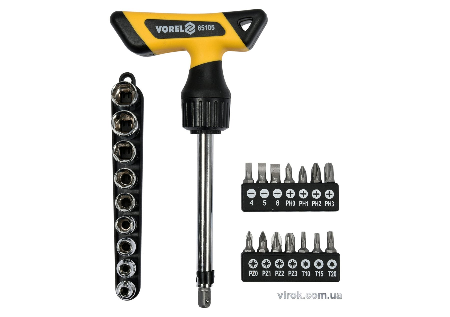 Викрутка реверсивна Т-подібна VOREL: тріщатка, з насадками і головками 1/4". [Набір 25 Елем.] [6/36]