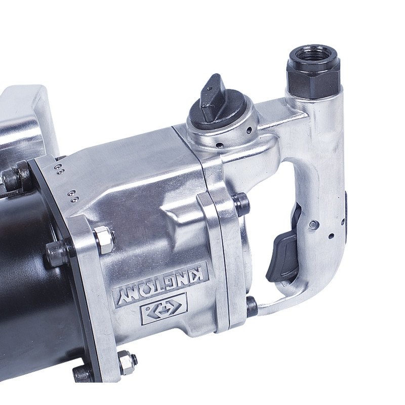 Особливості гайковерта Кінг Тоні 33832-180 Ударний механізм «Подвійний молот» та подовжений вал розкривають потенціал пневматичного обладнання. Працювати з гайковёртом зручно у важкодоступних місцях з елементами кріплення великих розмірів. Перед такою потужністю не встоїть метиз, що заржавів або прикипіл. Корпус інструменту виготовлений із легкого алюмінієвого сплаву. Вал із посадковим квадратом – із хромомолібденової сталі. Для зручності роботи є знімна рукоять, що допомагає утримувати габаритний інструмент на вазі слюсарю. Підведення стисненого повітря та випуск надлишків знаходяться на нижній частині основної рукоятки.