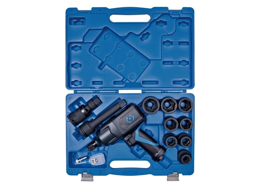 Склад набору: Гайковерт 3/4" зусиллям 1491нМ, 8000об/хв., Витрата повітря 190літ/хв., вага 2,35кг. голівки 3/4" ударні: 19, 22, 24, 27, 30, 32, 36, 38мм подовжувач ударний 175мм кардан ударний Лубрикатор Штуцер