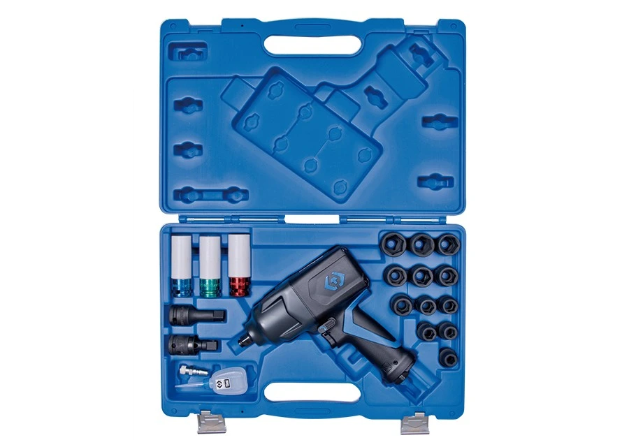 19 шт. 1/2" DR. Композитний ударний гайковерт та набір головок 12 шт. стандартна ударна розетка 10 ~ 24мм 1 шт. Ударний гайковерт 3 шт. Удароміцні розетки з пластиковою втулкою 17 ~ 19мм 1 шт. Подовжувач 1 шт. універсальний шарнір 1 шт. адаптер подачі повітря