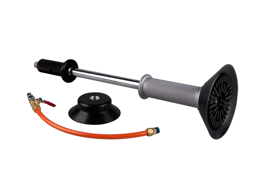 Насадки діаметром: 60 мм, 120 мм, 150 мм Зворотний пневматичний молоток для редагування кузова на площинах. Принцип роботи в тому, що в ручці стоїть сепаратор, який створює зворотний тиск. Таким принципом він витягує вм'ятини, якщо зусилля мало використовують зворотний молоток який зі ста відсотковою ймовірністю витягне бавовну. У комплекті три насадки велика, середня та маленька, шланг з роз'ємом та краном. Роз'єм стандартний під європейські штуцери. Зворотний молоток добре зарекомендував себе в галузі роботи з металевими поверхнями, а саме рихтувальні роботи кузова автомобіля. Для невеликої зміни геометрії кузова автомобіля не обов'язково використовувати дороге обладнання, достатньо скористатися зворотним молотком. Зворотним молотком можна виконати невеликі кузовні роботи самостійно, не вдаючись по допомогу до фахівців.