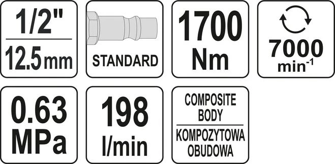 YATO Гайковерт ударний пневматичний : квадрат 1/2", F=1700 Nm, 0.63 MPa,198 л/хв