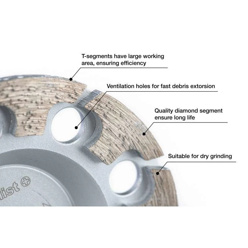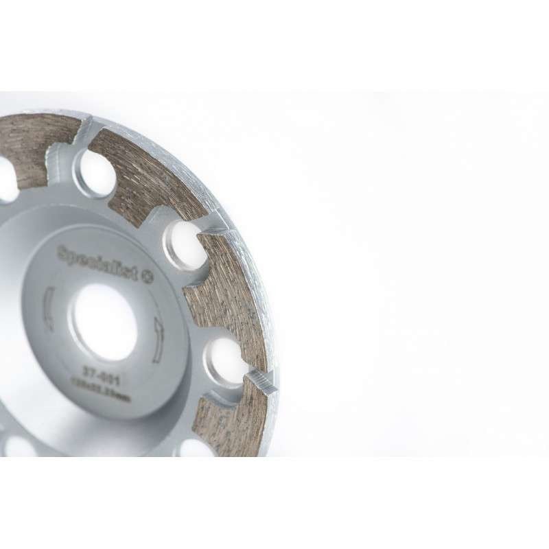 Диск має два ряди алмазних сегментів, які забезпечують ефективну роботу та тривалий термін служби. Ідеально підходить для усунення дефектів бетону, швів, що залишилися після заливання, видалення старої фарби. Після роботи з таким диском вже не буде жодних «завусениць», горбків та гострих зрізів.Такий диск допоможе значно покращити експлуатаційні та декоративні характеристики бетону.