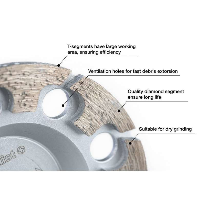 Необхідний інструмент для шліфування бетону. Диск призначений для використання з кутовою шліфувальною машиною 125 мм без води. Зазвичай, такий диск використовують для матеріалів середньої твердості, таких як бетон, цегляна кладка, камінь, бетонні вироби.