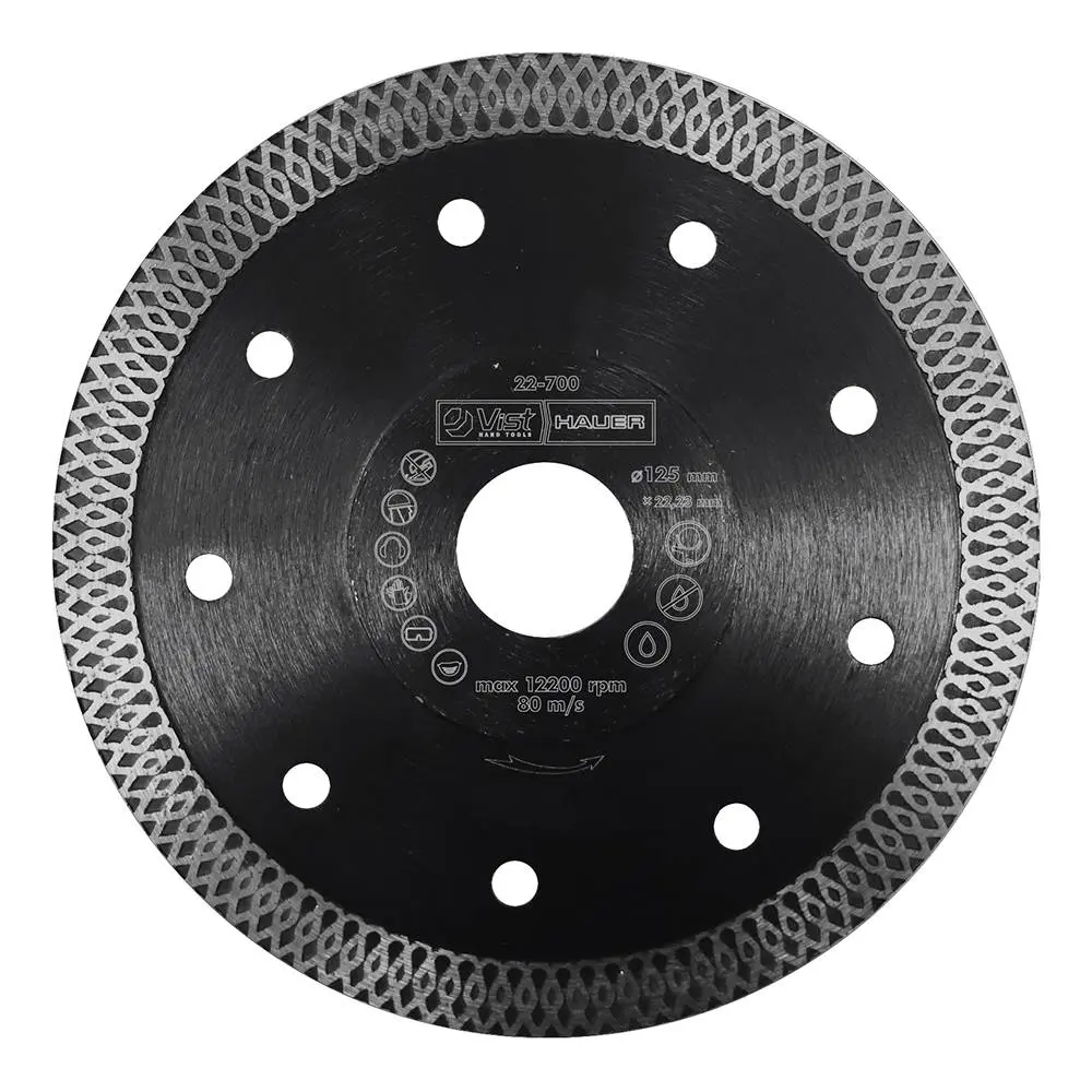 Виготовлені по технології Hot Press ( гаряче спікання) підвищує ресурс і довговічність диску. Диск робить точний і якісний пропил, забезпечує точне різання з чистими краями. Для збільшення швидкості різу застосований спеціальний тонкий корпус, посилений в центрі. Диск призначений для різання керамічної плитки, мармуру, керамограніта, граніту, бетону, декоративної плитки та інших твердих матеріалів. Завдяки хвилястій формі ріжучого шару, диск під час роботи краще охолоджується повітрям, тому його можна використовувати для сухого різу. Також диском можливо різати з додаванням води для охолодження, що значно збільшить термін служби диску. У разі, якщо вам необхідно провести якісне різання твердих матеріалів - цей диск саме те, що вам потрібно. Збільшена висота ріжучих сегментів знижує бічне тертя, а так само підвищує термін служби диску і робочу швидкість. Алмазний диск використовується з кутовою щліфмашиною, ручним електричним плиткорізом.