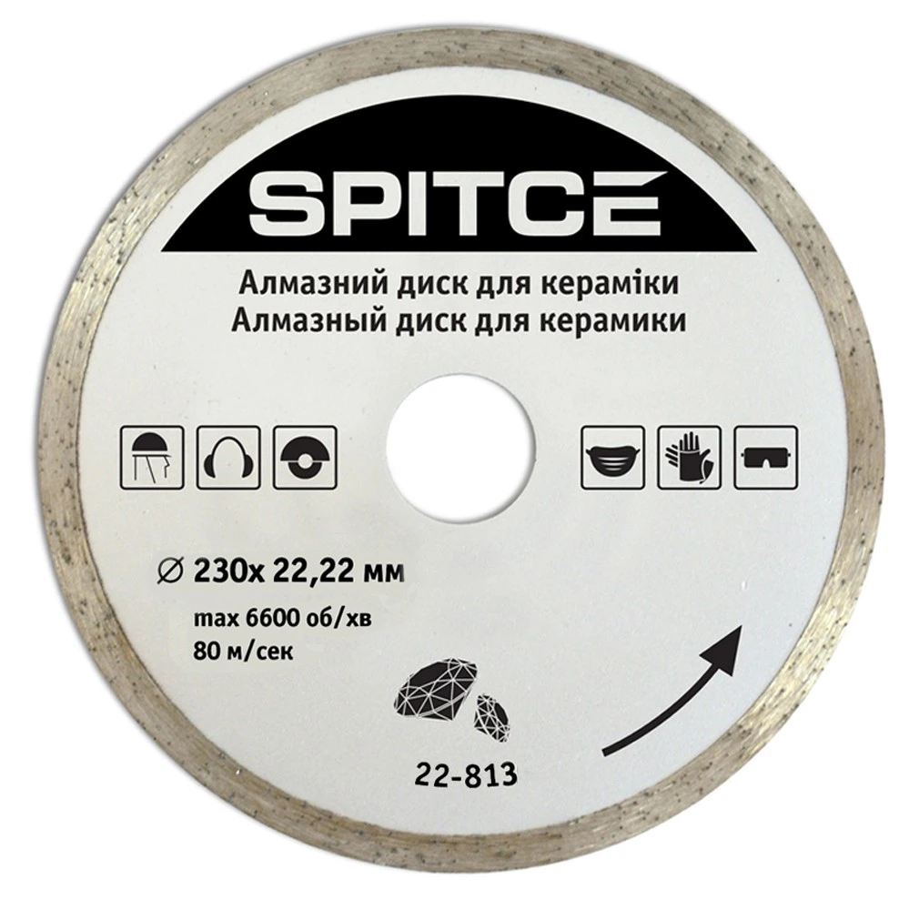 Алмазний диск для кераміки призначений для чистового різання кераміки, мармуру та каменю. При використанні диску по кераміці, необхідно забезпечити доступ води в місце різу для охолодження диску та матеріалу, що оброблюється. Алмазний відрізний диск має безперервний алмазний шар, що дозволяє добитися рівного зрізу без сколів. Ріжуча частина має функцію самозаточування, забезпечує високу продуктивність різання, при якому ріжуча кромка самовідновлюється за рахунок видалення зношених і вивільнення нових алмазних елементів. Використовується з кутовою шліфувальною машиною, ручним електричним плиткорізом, штроборізом.