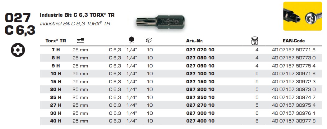 Бита FELO ( ФЕЛО ) TORX TR 20х25 мм, 1/4, C 6.3.