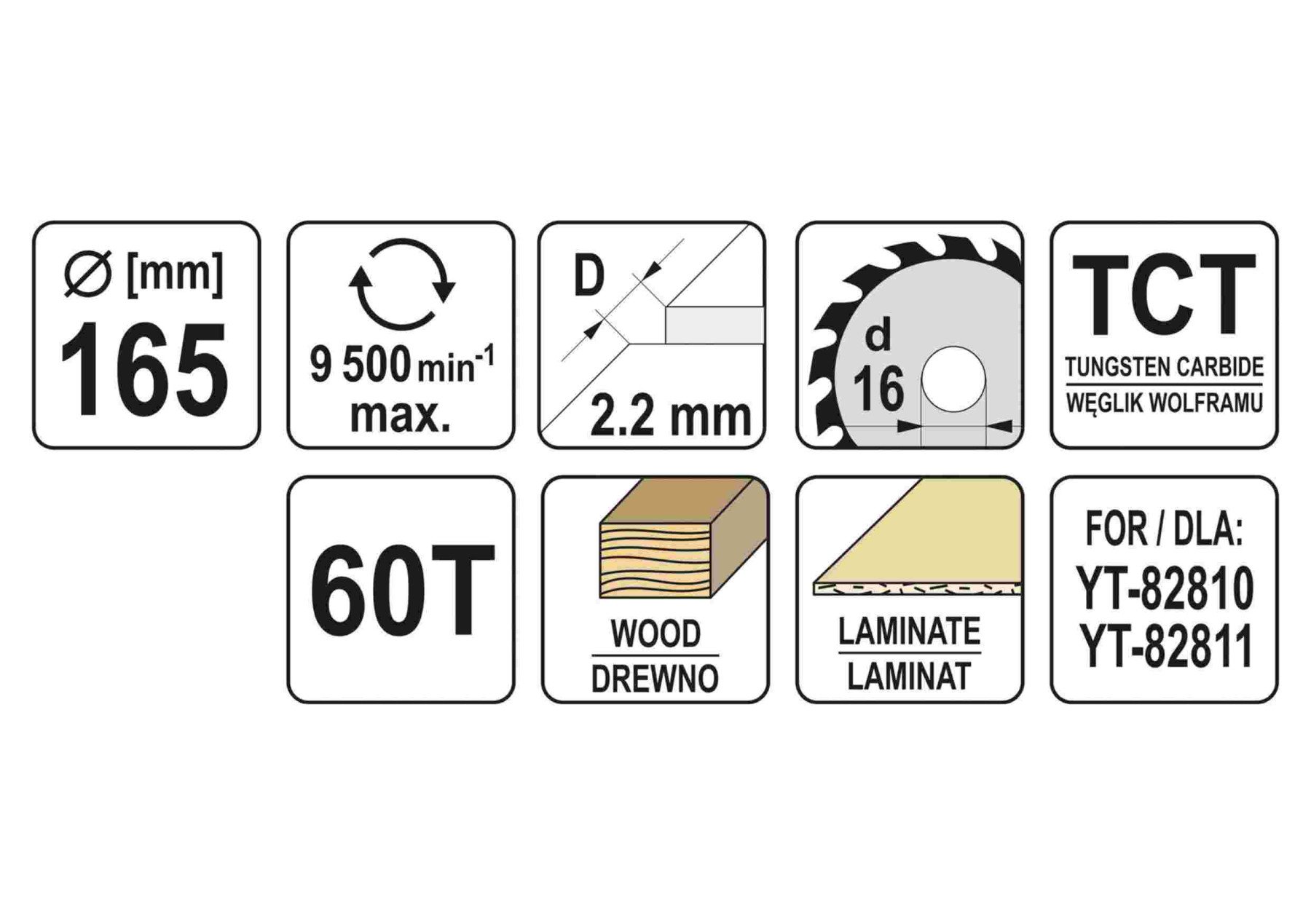 YATO Диск пиляльний победітовий по дереву: 165x16x2.2x1.5 мм, 60 зубців, R.P.M до 9500 1/хв