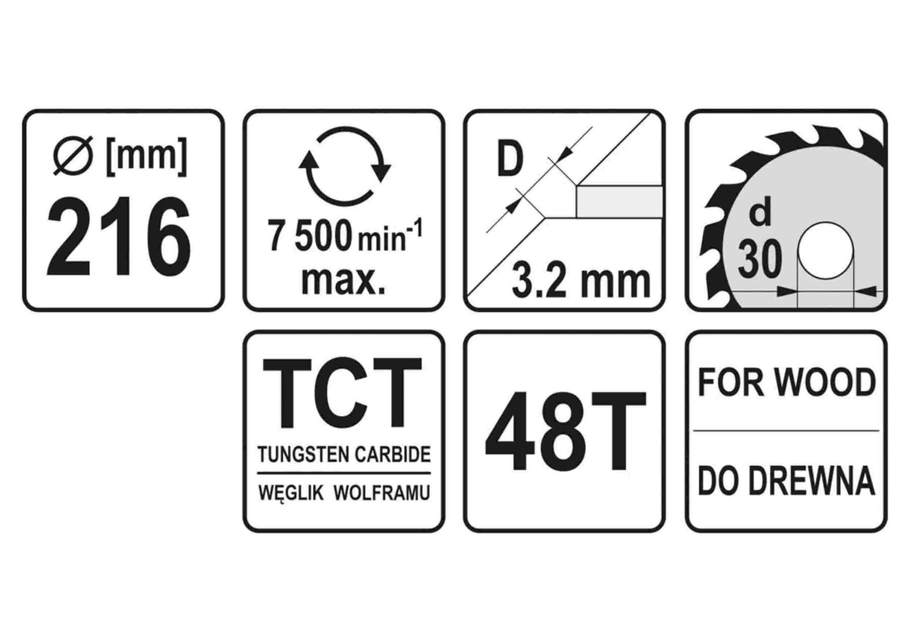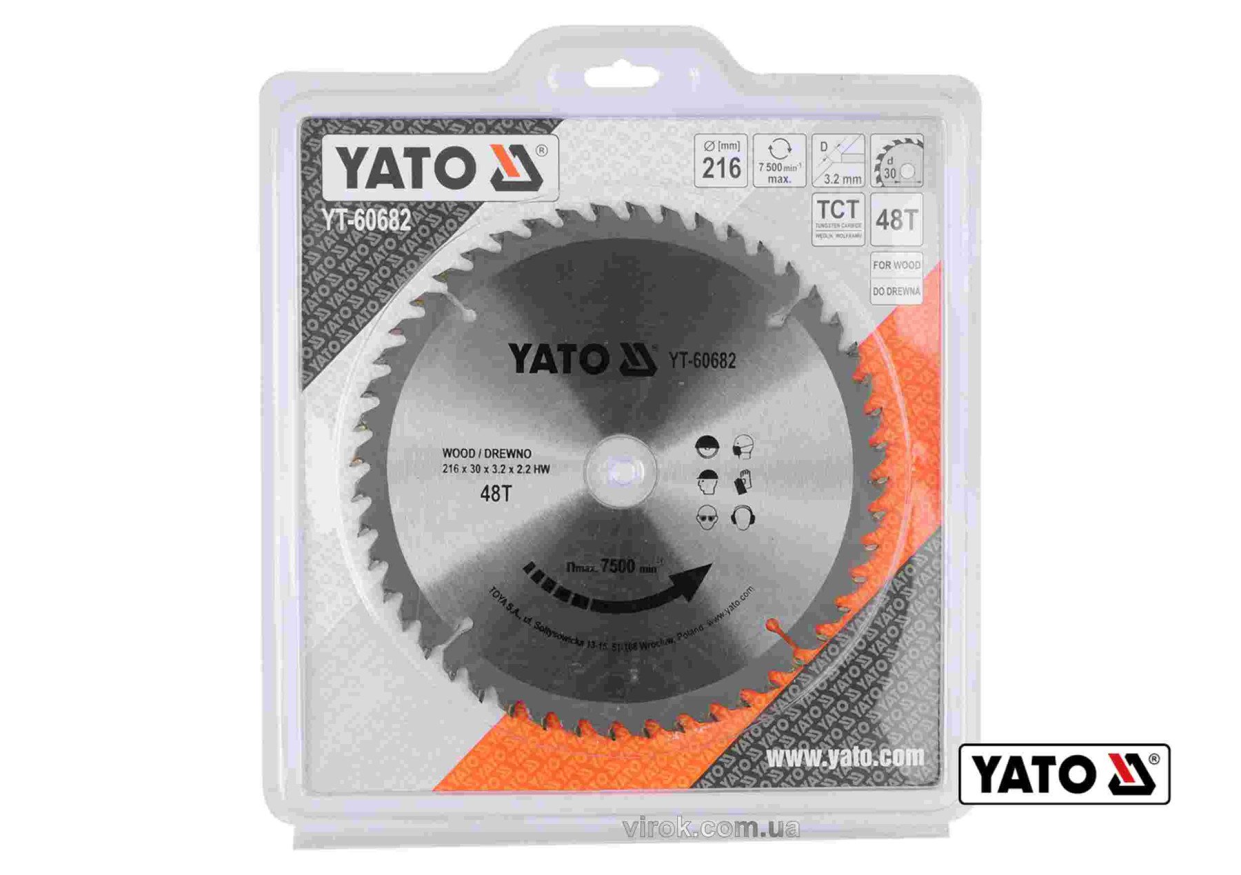 YATO Диск пиляльний победітовий по дереву YATO: 216х30х3.2х2.2 мм, 48 зубців, R.P.M до 7500 1/хв | YT-60682