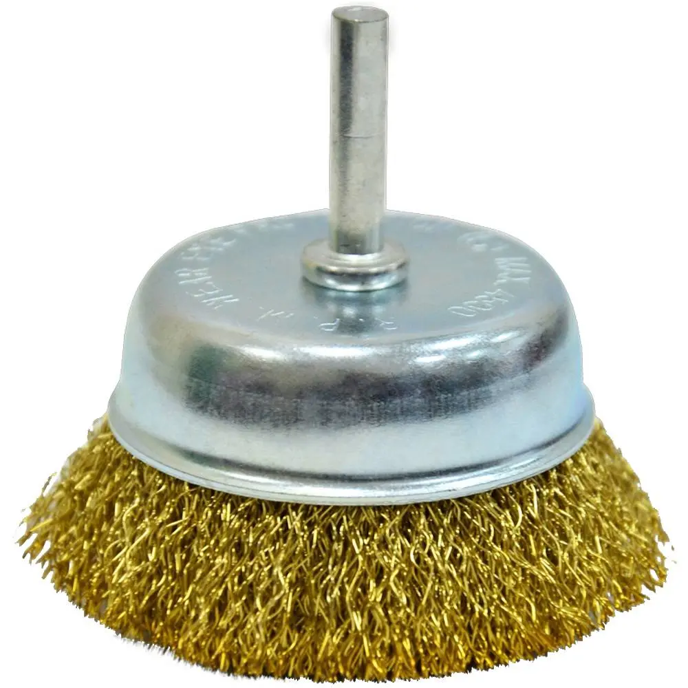 Щетка-крацовка 'Чашка' стальная латунная со шпилькой для дрели. Используется для очистки металлических поверхностей в угловых местах от ржавчины, лакокрасочных покрытий, подготовки поверхности для покраски или сварки. Также возможно использовать для текстурирования дерева. Щетки с проволочным ворсом не являются режущими инструментами. Они удаляют примеси, такие как шлак, силикаты и налет без изменения самой поверхности. При работе щетками количество искр меньше, чем при работе шлифовальными дисками. Проволока прочно закручена в витки и надежно закреплен в обойме, что обеспечивает длительный ресурс работы.