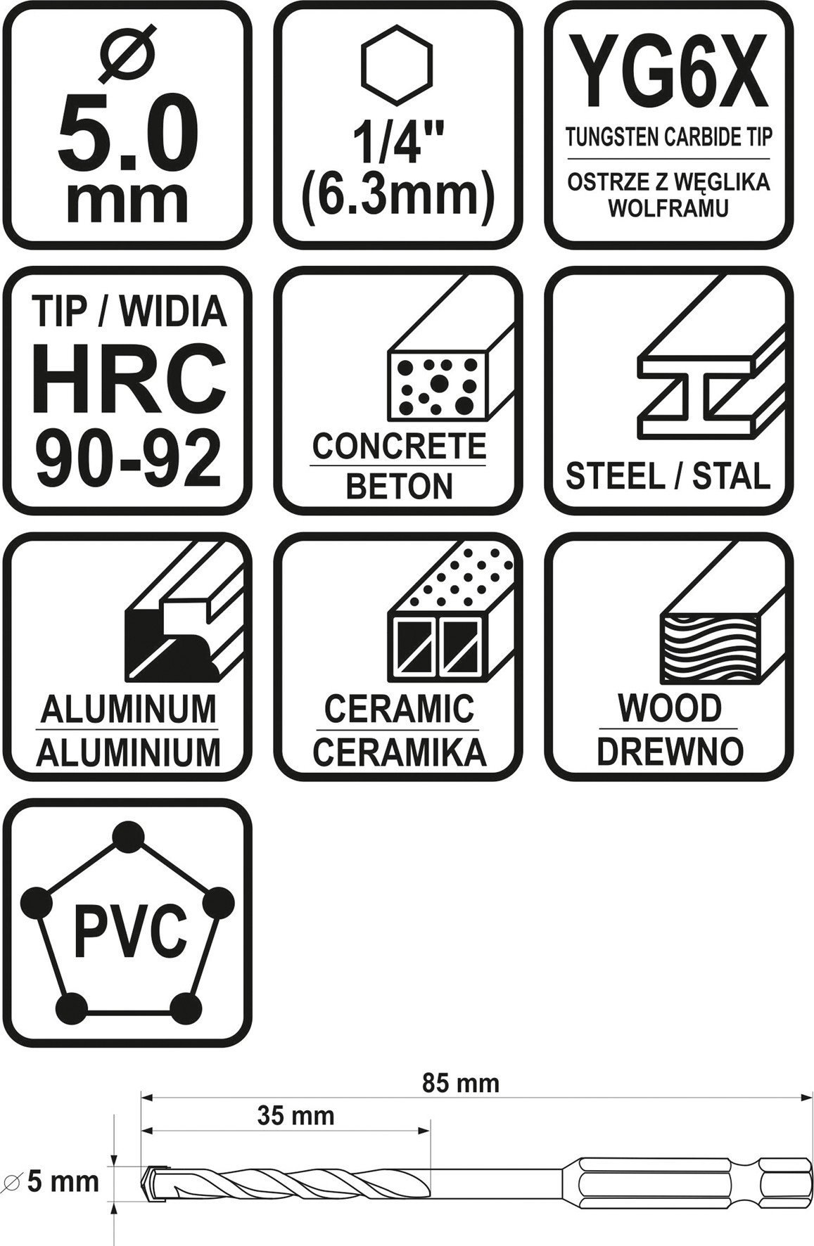 STHOR Свердло універсальне : YG6X, з 6-гран. хвостовиком-1/4", Ø= 5 мм, l= 85/35 мм | 21684
