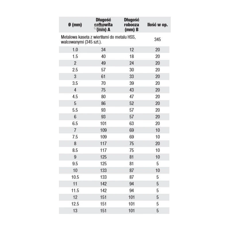 Набір свердел по металу Шафка (345 шт) Особливості Свердла по металу із твердої сталі DIN 338 для високошвидкісного свердління. Стандартна ріжуча кромка у формі долота з кутом заточування 118 °. Оксидне покриття для швидкого видалення стружки. Свердла з N дизайном шнека та стандартним кутом нахилу канавки. Для свердління сталі, чавуну, інших маталів та сплавів з межею міцності на розрив 800 Н/мм. Колір чорний Кількість в упаковці:345 Комплектація Свердло по металу HSS-R DIN338 1.0 х 34 мм - 20 шт Свердло по металу HSS-R DIN338 1.5 х 40 мм - 20 шт Свердло по металу HSS-R DIN338 2 х 49 мм - 20 шт Свердло по металу HSS-R DIN338 2.5 х 57 мм - 20 шт Свердло по металу HSS-R DIN338 3 х 61 мм - 20 шт Свердло по металу HSS-R DIN338 3.5 х 70 мм - 20 шт Свердло по металу HSS-R DIN338 4 х 75 мм - 20 шт Свердло по металу HSS-R DIN338 4.5 х 80 мм - 20 шт Свердло по металу HSS-R DIN338 5 х 86 мм - 20 шт Свердло по металу HSS-R DIN338 5.5 х 93 мм - 20 шт Свердло по металу HSS-R DIN338 6 х 93 мм - 20 шт Свердло по металу HSS-R DIN338 6.5 х 101 мм - 20 шт Свердло по металу HSS-R DIN338 7 х 109 мм - 10 шт Свердло по металу HSS-R DIN338 7.5 х 109 мм - 10 шт Свердло по металу HSS-R DIN338 8 х 117 мм - 20 шт Свердло по металу HSS-R DIN338 8.5 х 117 мм - 10 шт Свердло по металу HSS-R DIN338 9 х 125 мм - 10 шт Свердло по металу HSS-R DIN338 9.5 х 125 мм - 5 шт Свердло по металу HSS-R DIN338 10 х 133 мм - 10 шт Свердло по металу HSS-R DIN338 10.5 х 133 мм - 5 шт Свердло по металу HSS-R DIN338 11 х 142 мм - 5 шт Свердло по металу HSS-R DIN338 11.5 х 142 мм - 5 шт Свердло по металу HSS-R DIN338 12 х 151 мм - 5 шт Свердло по металу HSS-R DIN338 12.5 х 151 мм - 5 шт Свердло по металу HSS-R DIN338 13 х 151 мм - 5 шт
