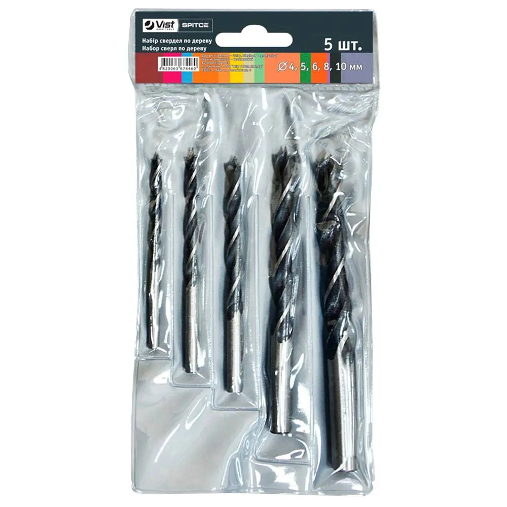 Спіральні свердла в наборі виготовлені з інструментальної сталі твердість становить 45 - 58 HRC. Наявність спеціального центруючого різця дозволяє швидко і якісно свердлити деревину. За рахунок особливої ??конструкції свердел, що відносяться до гвинтового типу, при їх використанні із зони обробки ефективно видаляється стружка. Гвинтове свердло, крім того, забезпечує високу точність і виключно високу якість виконуваної обробки. Призначені для свердління отворів в твердих та м'яких породах деревини, а також ДСП, МДФ та ін. Набір свердел в поліетиленовій упаковці. Використовуються з ручним електродрилем.