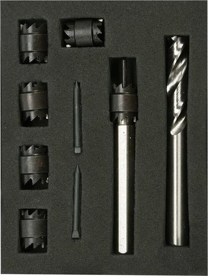 Набор для высверливания точечной сварки YATO YT-28920 предназначен для быстрого удаления швов, сварных соединений, сварных швов кузова автомобиля. Включает в себя 6 двусторонних фрез кружевных, фиксатор, 3 штифта фиксации и специальное сверло HSS 8 мм.