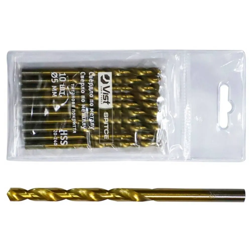 Свердло по металу виготовлено зі швидкоріжучої сталі (HSS) твердістю 61 - 62 HRC з циліндричним хвостовиком. Заточка робочої частини свердла звичайна під кутом 130°. Титанове напилення знижує перегрів і покращує вихід стружки. Це значно підвищує стійкість до стирання і твердість робочих крайок свердла. Використовуються для свердління отворів у сталі та сплавів зі сталі (легованих і нелегованих), сірого чавуну, ковкого чавуну, металокерамічних сплавів на основі заліза. Також свердла можливо використовувати для свердління отворів в таких матеріалах як дерево, фанера (ДВП, ДСП, ОSB), пластмаса. Виготовлено згідно стандарту якості DIN338.