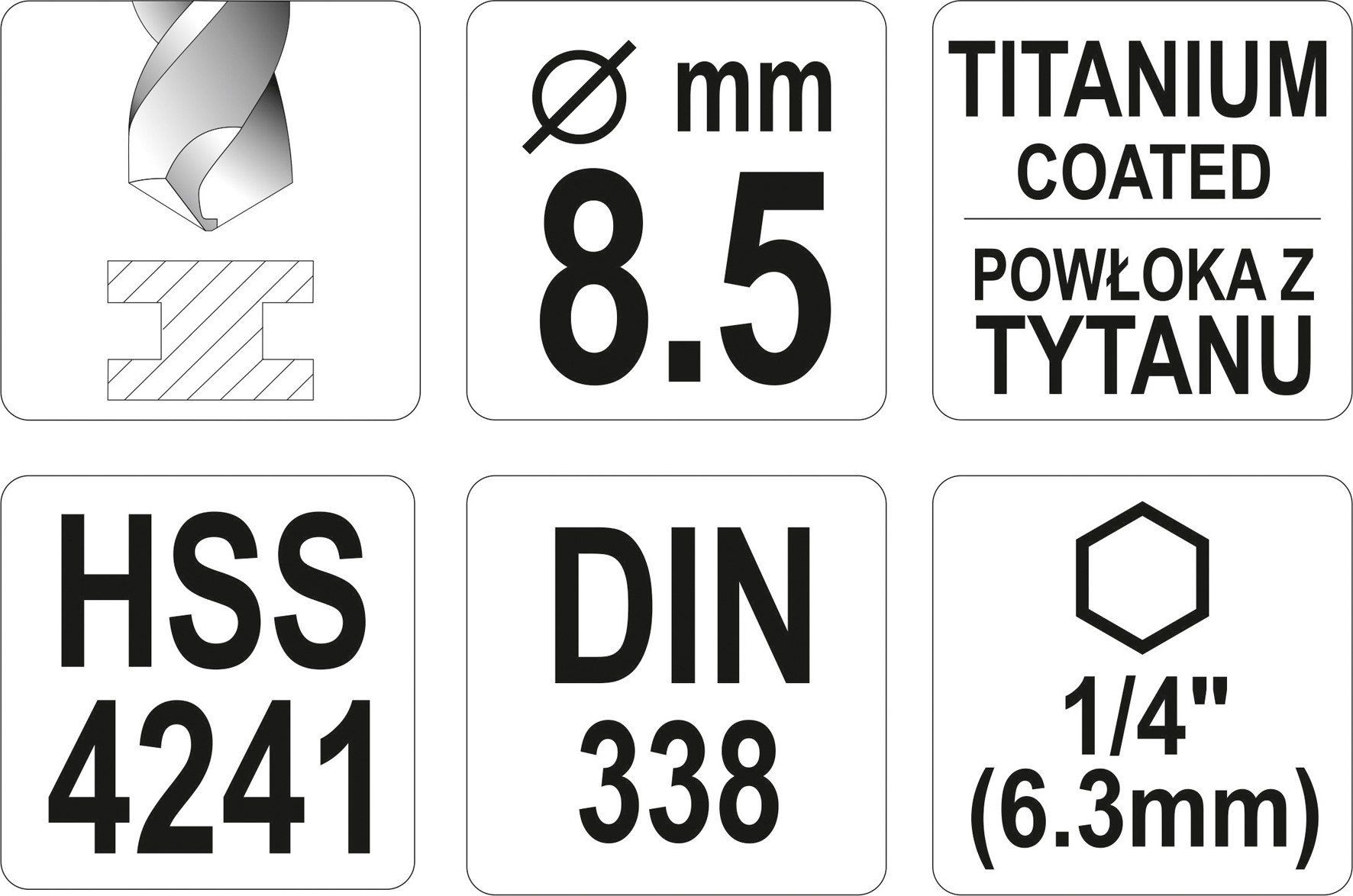 Свердло по металу титанове YATO : HSS-ТІN, Ø= 8,5 мм, l= 117 мм, 6-гран. HEX-1/4"
