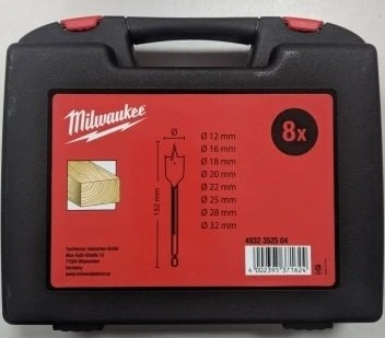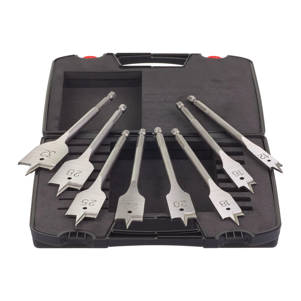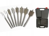 Набір свердловин (8 шт) Особливості Швидке свердління великих діаметрів Для роботи з природною твердою та м'якою деревиною та ДСП Ідеальні при встановленні дверних замків, виготовлення пазів, а також електричних та сантехнічних робіт. 1/4" шестигранний хвостовик (DIN E 6.3) для безпосередньої установки в шпиндель інструменту або для надійного закріплення в патроні Центруючі вістря для точного засвердлювання, гострі допоміжні кромки для покращення якості різання Комплектація Свердла 152 мм: 12/16/18/20/22/25/28/32 мм Дерев'яний кейс