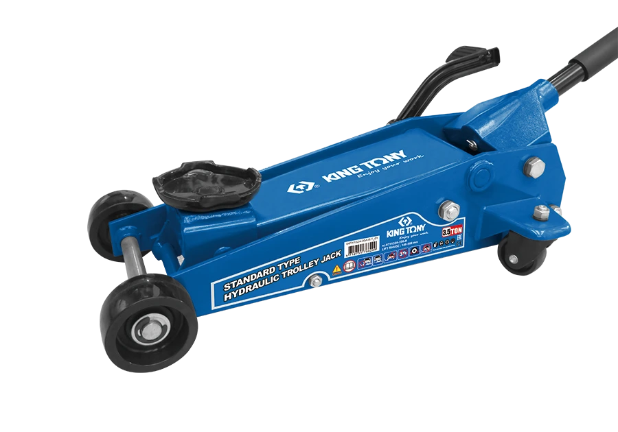 У чому вигода купити підкатний домкрат Кінг Тоні (9TY132A-35A-B) Особливість домкрата в тому, що він виготовлений у вигляді візка. Є колісна база і подовжена рукоятка, що дозволяють переміщати конструкцію по гаражу, не відриваючи її від підлоги. Робота з домкратом дуже спрощена. Вбудований гідроциліндр дуже швидко накачується, висуваючи шток нагору. Хід поршня в обох напрямках дуже плавний, немає ривків. У домкрата відмінна вантажопідйомність, що дозволяє обслуговувати, окрім легковиків, позашляховики, пікапи, фургони. Матеріал виготовлення домкрата – високовуглецева легована сталь. Оздоблення – захисне порошкове покриття, лакування. Конструкція розбірна, що обслуговується. За бажання можна навіть поміняти коліщатка, орієнтуючись на тип робочої поверхні. П'ята штока знімна - можна змінювати або встановлювати спеціальні підкладки.