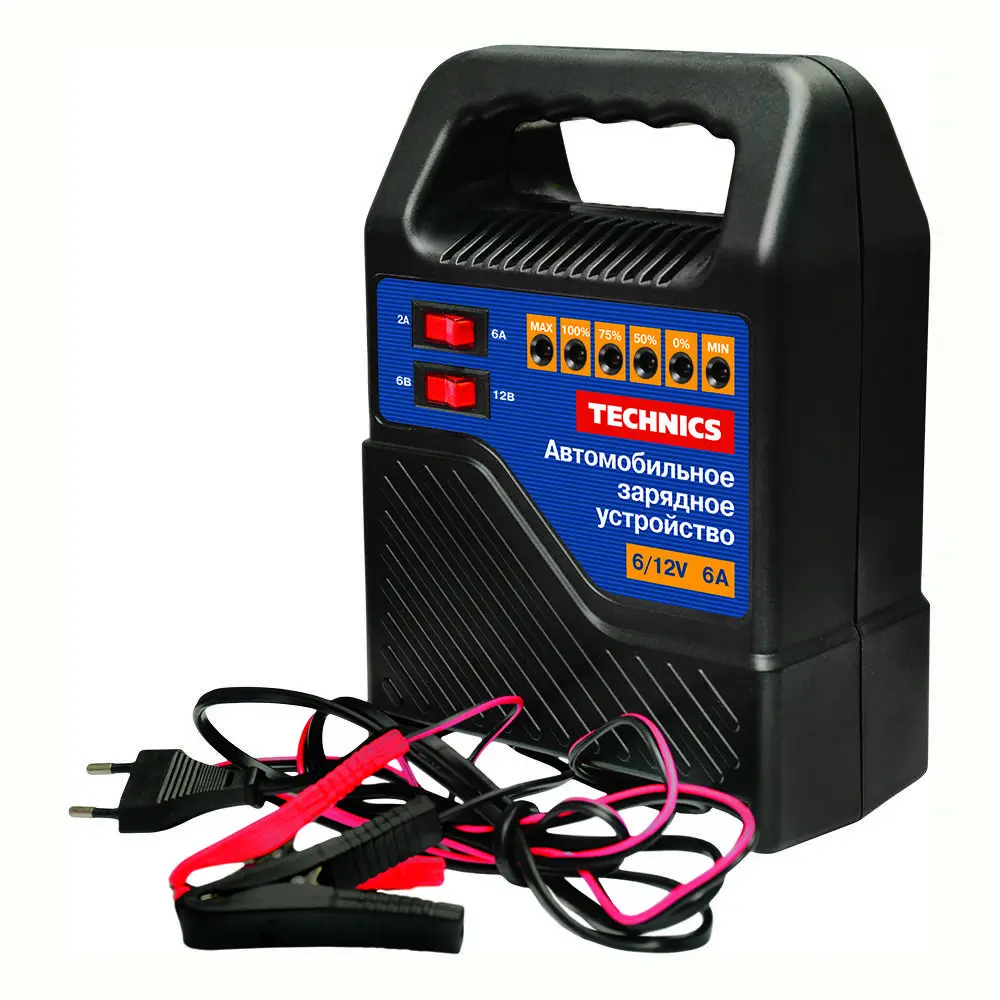 Зарядний пристрій AC01 Technics призначений для зарядки акумуляторних батарей 6 В і 12 В, які використовуються в мотоциклах, легкових автомобілях і інших механічних засобах. Пристрій оснащений системою захисту від короткого замикання, захистом від перезарядки і функцією безперервної підзарядки. Простота у використанні - перемикач 6В / 12В і 6 світлодіодних індикаторів. Якщо батарея повністю розряджена, загоряються всі 6 індикаторів. В ході зарядки батареї, індикатори поступово гаснуть, починаючи від індикатора 'мін'. Коли батарея повністю заряджена, горить один індикатор 'макс'.