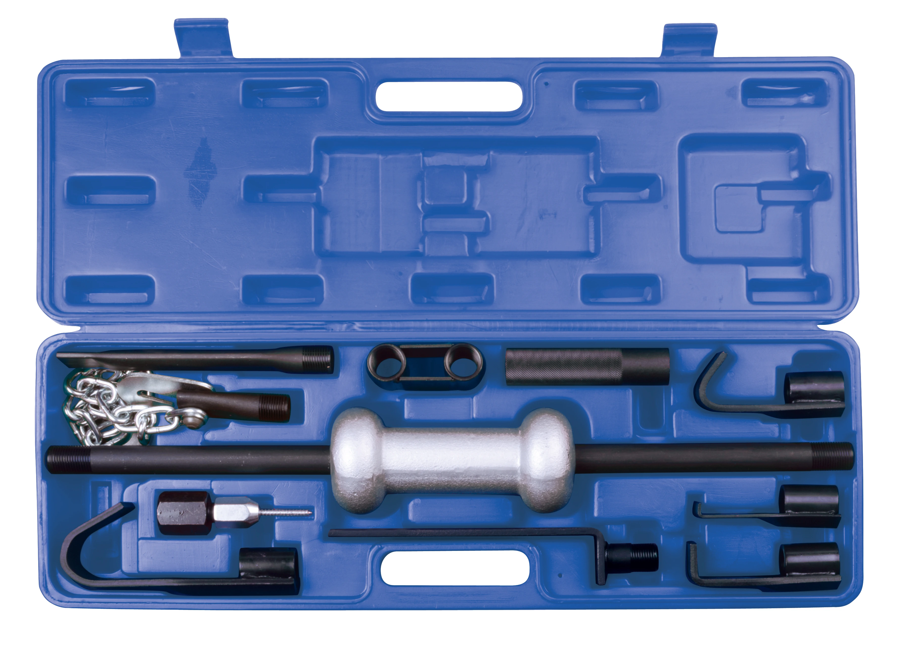 Набір для кузовного ремонту (зворотний молоток та 9 насадок), 10 пр.9CH01 Інструмент для професіонала Набір для ремонту кузовів використовується для відновлення цілісності корпусу автомобільного транспорту. Ручний інструмент позиціонується на ринку як обладнання для доступу до важкодоступних або прихованих площин кузова, включаючи краї, краї або пороги. Зворотний молоток та 9 насадок допоможуть слюсарю усунути вм'ятини та випрямити кузов автомобіля. Рихтування з пристосуванням продуктивне і комфортне. Принцип дії Зворотний молоток – недооцінений автолюбителями інструмент, який у руках професіонала чи новачка продемонструє функціональність. На металевий штир півметрової довжини, з одного боку, накручується рукоятка. На штир надівається обтяжувач у вигляді гантелі, яка розточена по довжині під діаметр трубки. На іншому боці молотка нарізане різьблення для монтажу насадок. Власник вибирає відповідний для відновлення інструмент і накручує на металевий штир. Зачепивши насадкою пошкоджену частину кузова автомобіля, слюсар фіксує однією рукою молоток, тримаючи за ручку. А другою рукою встановлює обтяжувач ближче до зачепа та хльосткими, але не сильними рухами, методично переміщує бік по штирю, ударяючи об корпус рукояті. Сила удару варіюється користувачем, що візуально визначає відновлення. Експерти рекомендують потренуватися на металоконструкціях із силою удару, перш ніж підходити до кузова автомобіля. Корисні насадки для зворотного молотка Набір для кузовного ремонту з дев'ятьма компонентами обійдуться власнику дорожче, ніж класичний зворотний молоток, проте функціонал ручного інструменту, що пропонується, на порядок вищий. Гаки, що йдуть у комплекті, впораються з поставленим завданням. Прямі та кутові гаки представлені у вузькому та широкому форм-факторі. Для доступу до прихованих місць у наборі є ланцюг, який не можна нарощувати. Підібратися до важкодоступних елементів кузова допоможе насадка із шурупом або саморізом у вигляді електрода для зварювання. Для зміщення центру осі зворотного молотка в наборі є перехідник під різьбове з'єднання. Перевага ручного інструменту Відсутність електроніки і компонентів, що рухаються, в механізмі зворотного молотка знижує ризики поломки ручного інструменту. Проста конструкція не потребує додаткових знань. Освоювання принципу дії забирає 5-10 хвилин, після чого власник вже вдосконалює навички відновлення кузова автомобіля. За бажанням, змінити бойок власнику не проблематично - гиря, що йде в комплекті, піддається обтяженню або встановлюється інша гантель. Взаємозамінність інструменту King Tony не виключає додавання до набору додаткових елементів. Інструмент виконує завдання класичного молотка, для цього напрям удару зміщується у бік насадки. Стійка до зносу легована інструментальна сталь продовжує термін експлуатації ручного обладнання, вимагаючи натомість лише дбайливе зберігання. Набір для кузовного ремонту поставляється в пластиковому кейсі, комфортному для транспортування і ручному інструменту, що гарантує безпеку. Комплектація: Рукоятка 540 мм. Молоток 6 фунтів/2,7 кг. Великий вигнутий гак. Малий гачок. Великий гак 90˚. Малий гак 90˚. Плоскі насадки. Пряма насадка. Подвійне кріплення. Гвинт, що самонарізає. Кріплення гака з ланцюжком.