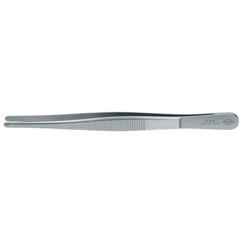 Пінцет захватний прецизійний KNIPEX 92 72 45 універсальне застосування пряма форма притуплені широкі губки захоплююча поверхня рифлена губки заокруглені шириною 3,5 мм захоплюючі площини із зубцями матова поверхня пружинна сталь нержавіюча, немагнітна Виконання нержавіюча, немагнітна Довжина загальна 145 mm Вага нетто 27 g