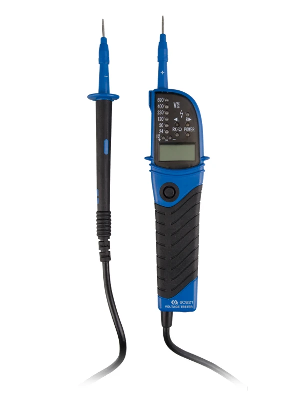 Електронний тестер напруги 690V є вимірювальним приладом, призначеним для професіоналів. Пристрій позиціонується на ринку як інструмент для станцій ТО, автотранспортних підприємств та сільськогосподарського сектора. Тестер напруги порадує користувача мобільністю, функціональністю та комфортабельністю у роботі. Корпус приладу, виконаний у вигляді указки із вбудованим щупом, виготовлений із твердого пластику та захищений за стандартом IP64. Другий щуп, у чорному кольорі, підключається до тестера знімним кабелем. Подібний пристрій електронного тестера економить час для користувача, адже інформативний дисплей завжди перед очима. Електронний тестер напруги 690V підтримує вимірювання змінного та постійного струму в межах 12-690 Вольт. Прилад демонструє зміну фази, діапазон частот та інформує про підвищену напругу при вимірюванні малого струму в електропроводці автомобіля. Тестер має самодіагностику, вимірює опір, і вміє перевіряти ланцюг на цілісність. Вбудований світлодіодний ліхтарик у корпус електронно-вимірювального приладу – приємний подарунок слюсарю, що працює з вузлами автомобіля у гаражі, що слабо освітлений.