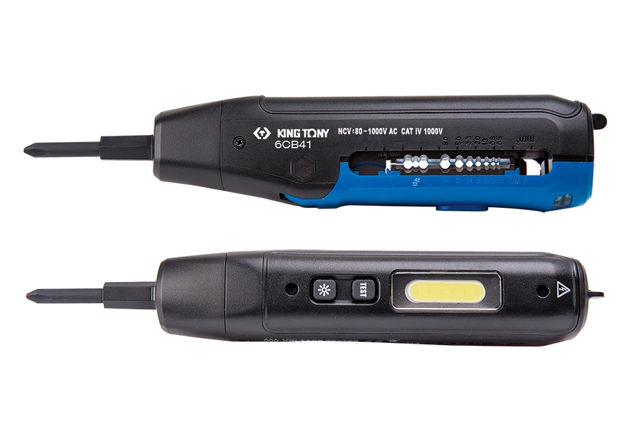 Мультифункціональний тестер 9 в 1 80 - 1000V KING TONY -Безконтактне визначення напруги 80-1000, автоматичне відключення через 3 хвилини. -Застосування: напруга змінного струму в розетках, освітленні, автоматичних вимикачах, проводах та кабелях тощо. -Освітлення: світлодіод COB. -Магнітні подушечки, які можуть бути корисними для утримання дрібних компонентів, таких як гайки та болті. -Викрутка № PH2 x1. -Батарея: 3 (AAA 1,5 x2) в комплекті. -Стандартна категорія: CAT IV 1000, EN 61010-1: 2010/A1: 2019, EN 62471: 2008, EN 61326-1: 2013, EN 61326-2-2: 2013