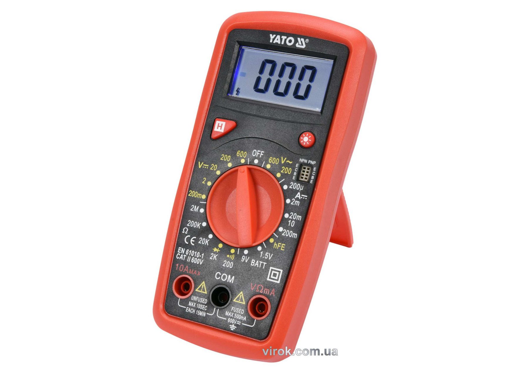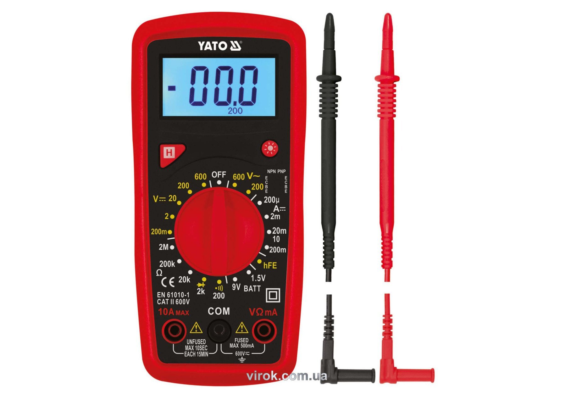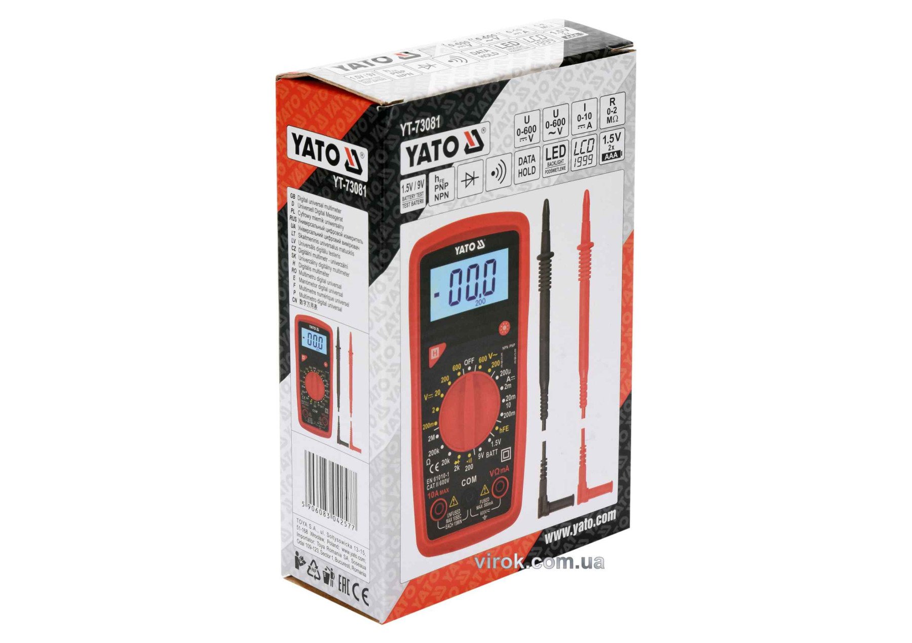 Мультиметр YATO YT-73081 - електричний вимірювач, який призначений для вимірювання напруги та струму, змінного та постійного. Також дозволяє вимірювати опір, провідність та контроль стану індикаторів. Мультиметр має пластиковий корпус і рідкокристалічний дисплей. Пристрій поставляється з вимірювальними проводами зі штирями на кінцях.