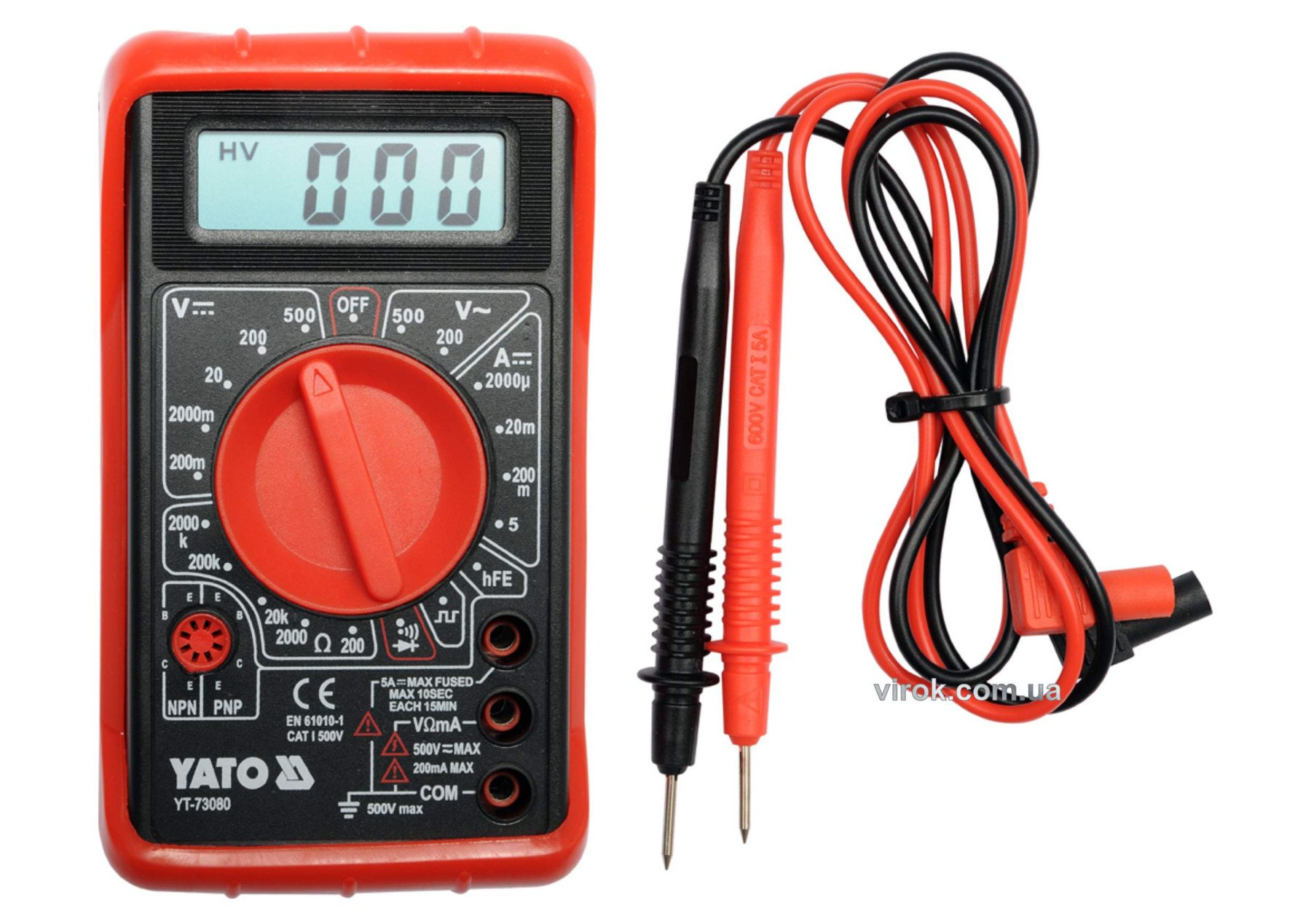 Мультиметр YATO YT-73080 - цифровий вимірювальний пристрій, який призначений для вимірювання різних електричних величин. Мультиметр має пластиковий корпус, рідкокристалічний дисплей, перемикач вимірювальних діапазонів. В корпусі встановлені вимірювальні гнізда, а також гніздо для перевірки транзисторів. Пристрій поставляється з вимірювальними проводами зі штирями на кінцях.