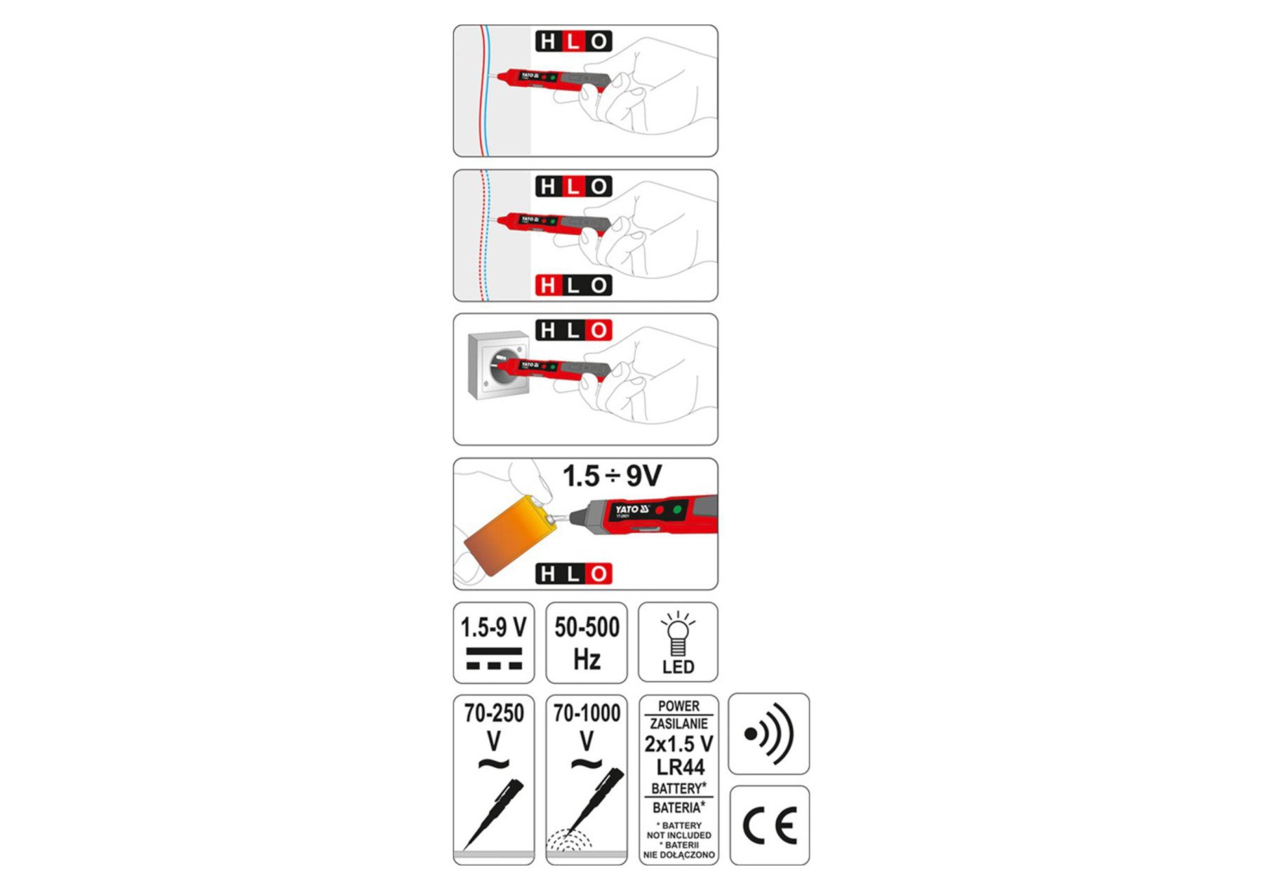 Тестер напруги YT-28631 є універсальним тестером, який може працювати на традиційну провірку, а також як бездротовий індикатор напруги. Це дозволяє визначити наявність електричної напруги, виявити напругу змінного струму, наприклад, під штукатуркою, а також провести перевірку цілісності кабелю та перевірити стан батарей або акумуляторів. Про наявність напруги сигналізує сигнал одного з діодів, розташованих в корпусі тестера.