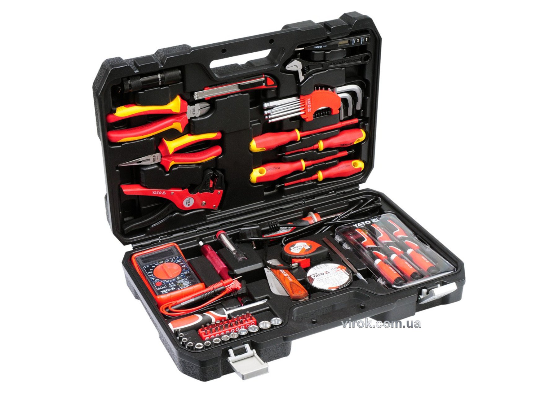 Професійний набір інструментів для електриків із 68 спеціально підібраних інструментів. Це хороший вибір як для електричної, так і автомобільної промисловості. Щипці та викрутки в наборі ізольовані до 1000 В.