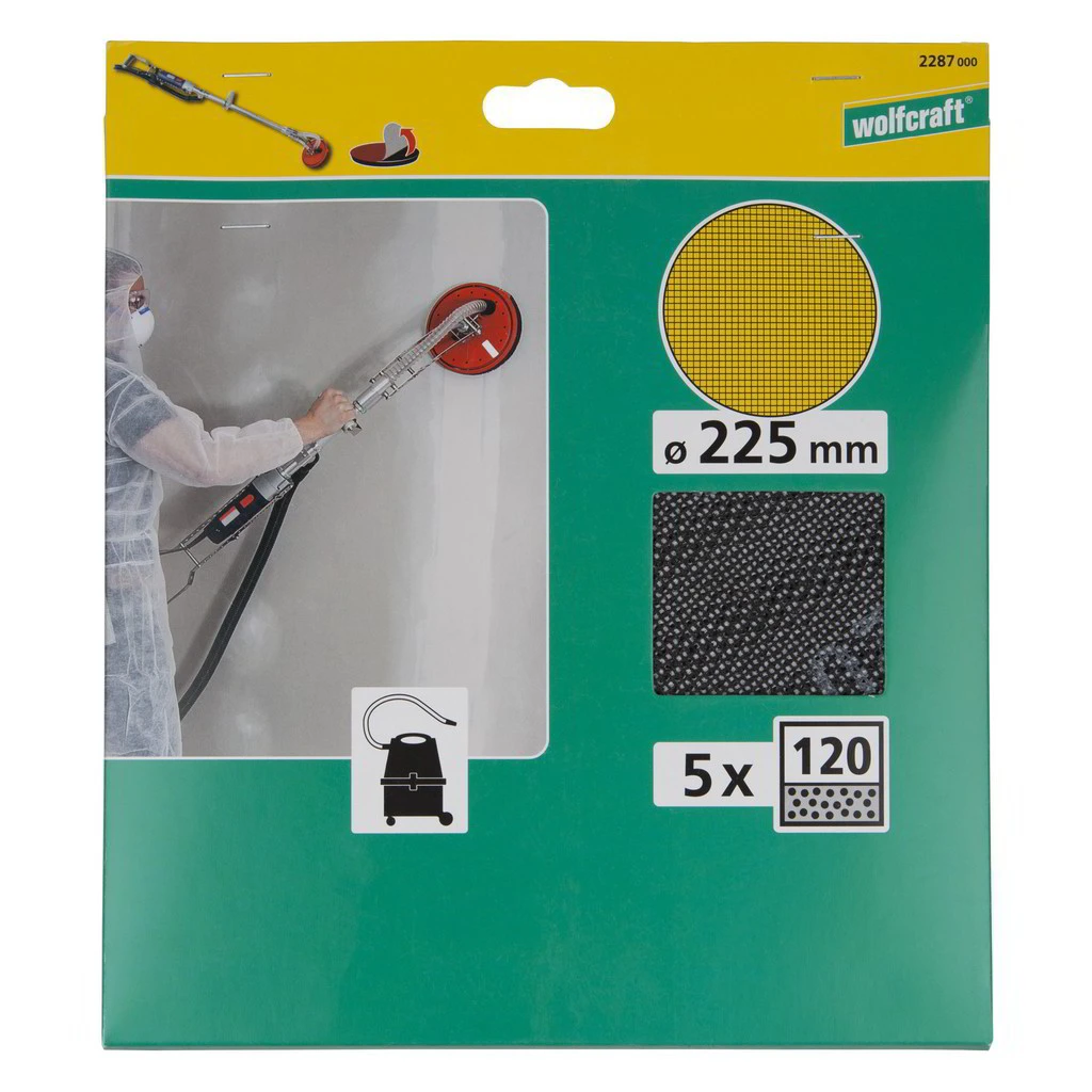 Шлифовальная сетка на липучке Wolfcraft 2287000 225 мм P120 (5 шт.). Легко фиксируется, для быстрой замены наждачной бумаги, до 4 раз долговечнее, чем стандартная наждачная бумага.