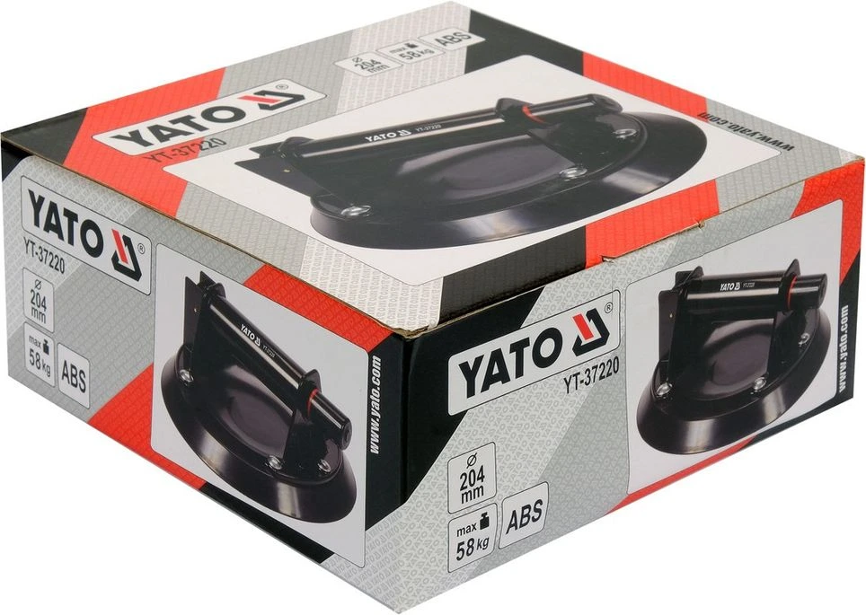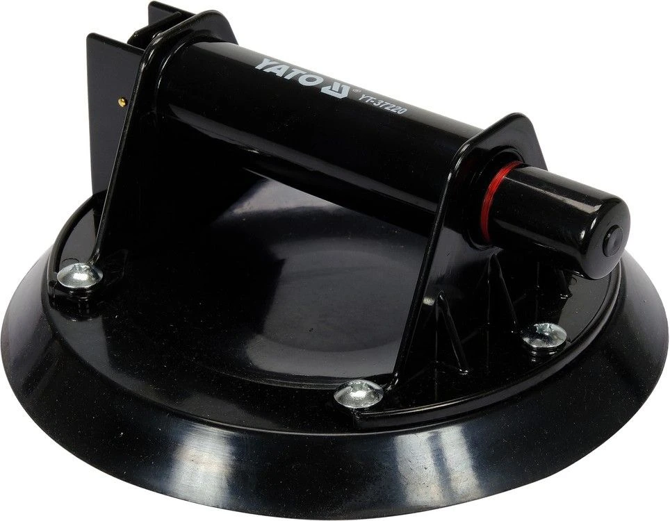 Держатель лобового стекла с вакуумным насосом YT-37220. Корпус из АБС-пластика. Он имеет плоскую резиновую присоску диаметром 204 мм/8 дюймов. Грузоподъемность 58 кг/128 фунтов. Рукоятку следует использовать на чистых, гладких и непористых поверхностях при температуре от -18 до 49. Он предназначен для перевозки стекла, ламинированных плит, листов и т. д. Изделие может поднимать 125% номинальной нагрузки в течение более 10 минут.