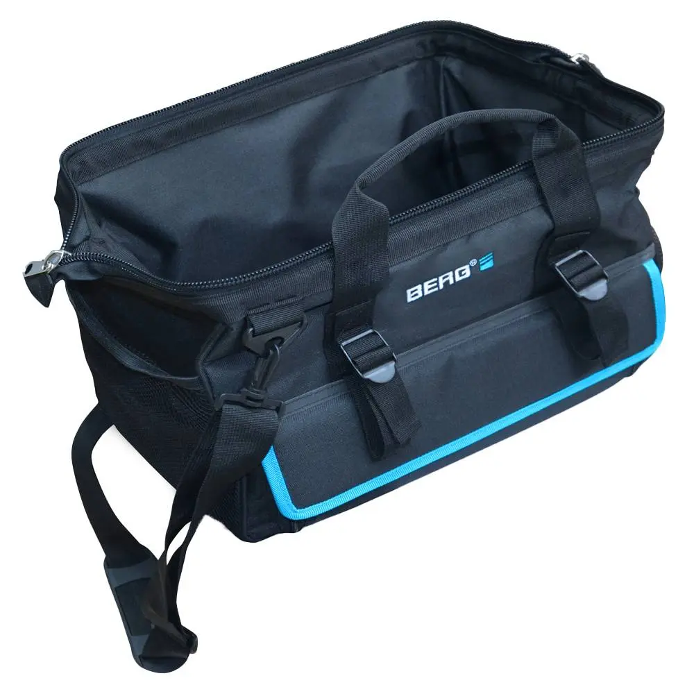 Сумка для инструментов изготовлена ??из высококачественного нейлона. Предназначена для транспортировки и хранения инструмента, деталей разного размера и измерительных приборов. Все инструменты компактно размещаются в 5 отделениях. Крепкие удобные ручки и ремешок для переноса на плече. Ремешок имеет мягкую накладку, которая снижает трение и смягчает давление на плечо во время транспортировки заполненной сумки. Молния, застегивается сверху, обеспечивает сохранение инструмента при транспортировке. Сумка имеет отдельное нижнее усиленное отделение для дрели или органайзера.
