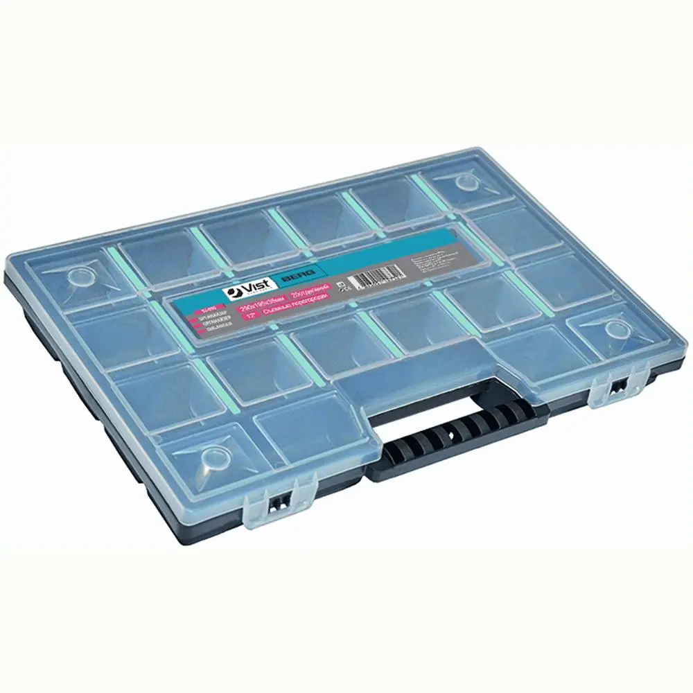 Універсальний органайзер для дрібниць з ручкою для перенесення, виготовлений з ударостійкого пластику. Завдяки прозорій поверхні не потрібно відкривати щоб побачити те, що знаходиться всередині. Органайзер має дві застібки для безпеки при зберіганні та перенесенні. В органайзері є перетинки, завдяки яким дрібні деталі не змішуються. Також перетинки при необхідності можна вийняти. Призначений для зберігання дрібних деталей, кріплення тощо. Завдяки такому органайзеру всі деталі легкодоступні і зберігаються в одному місці.