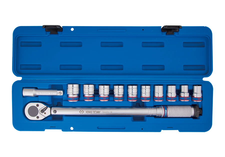 Набір динамометричних ключів 1/2” 42-210 Нм із шестигранними головками 13-24 мм - динамометричні ключі King Tony 34423-1A, 1/2" 42-210 Нм, - головки 1/Шестигранник 2 дюйми з розмірами: 13, 14, 15, 16, 17, 18, 19, 21, 22, 24 мм, подовження 1/2 дюйма завдовжки 100 мм. Все в пластиковій валізі розмірами 500х125х70 мм.