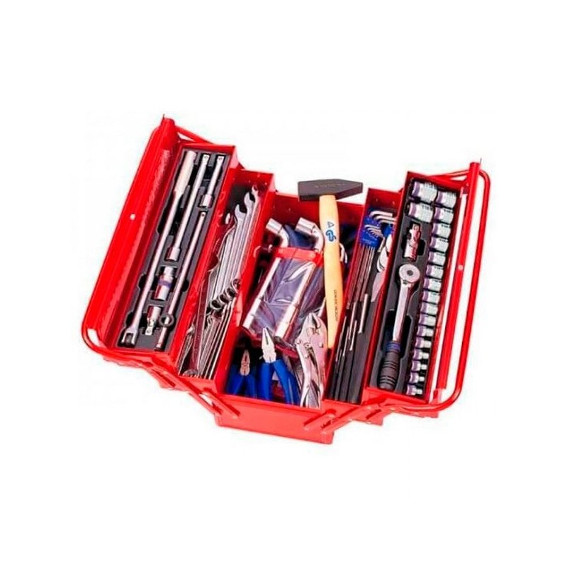 Набір інструментів 66 од. у ящику King Tony (902-066MR) – це різновид універсальних комплектів, що використовуються у слюсарних роботах. Випускається комплект для автосервісу. Але завдяки гарній комплектації та невеликим габаритам, користується попитом у будівельників, представників виробництва та аграріїв. Такий ручний інструмент буде корисним навіть любителям. Оснащення достатньо, щоб полагодити сантехніку, електротехніку або транспортний засіб. Комплектація набору із 66 предметів (902-066MR): · Ворота з торцевими головками (1/2”). У набір входять прямі коміри різних розмірів і одна тріскачка. Також присутні кардани, подовжувачі та перехідники для роботи з торцевими головками у важкодоступних місцях.· Набір комбінованих та Г-подібних ключів. Інструменти підібрані так, щоб повністю перекрити всі необхідні розміри для ремонту легкового автомобіля.· Шарнірно-губцеве слюсарне приладдя – пасатижі, кусачки, розвідні ключі та ручні лещата.· Комплект ударного інструменту - молоток, вибивання, зубило, кернер.· Викрутки та биті під різні шліци гвинтів та шурупів. Інструмент доповнюється зручним та містким саквояжем із металу. Кейс пофарбований шаром захисної порошкової фарби та має кілька ложементів під ручний інструмент.