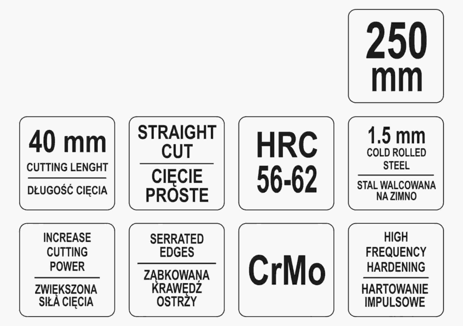 Ножиці по металу YATO YT-1962 призначені для різання листового металу. Леза ковані з хромованого молібдену (Cr-Mo). Корпус загартований до 46-52 HRC, ріжучі кромки - до 56-62 HRC, це дозволяє вільно різати сталеві листи, товщиною до 1.5 мм. Ручка покрита пластиковими накладками.