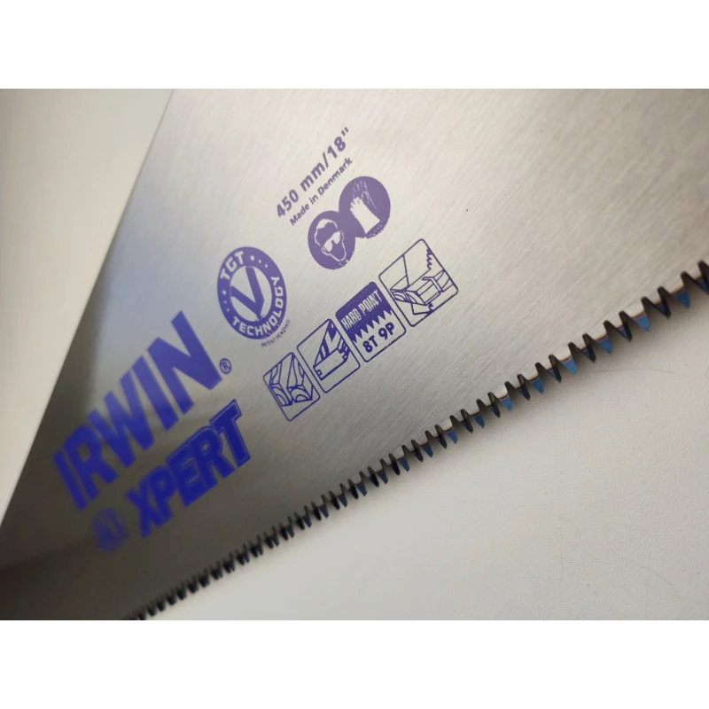 Ножівка по дереву XPERT 450мм 8T/9P універсальна, IRWIN Призначена для пиляння заготовок з деревини м'яких та твердих порід, фанери, ДСП, ПХВ. Жорстке полотно товщиною 1,00 мм із високоякісної холоднокатаної сталі С75, для максимальної стабільності та передачі зусилля оператора. Зуби мають тригранну заточку, виконану за технологією TGT, це дозволяє виробляти пиляння, коли пилка рухається не тільки вперед, а й назад. Оптимізоване розведення зубів для прямолінійного різу. Лезо інструменту покрите антикорозійним лаком на водній основі, що в 4 рази надійніше і довговічніше, ніж традиційне покриття. Дуже зручна ергономічна ручка із двох матеріалів, приварена ультразвуком для надійної фіксації. Також ручка має збільшене коло рукоятки (гарантує ідеальне відчуття контролю в процесі різання) і оптимізований простір для рук, що надає більше комфорту для роботи в рукавичках. Рукоятка має грані для побудови кутів 90 і 45 для зручності при розмітці. Асортимент ножівок IRWIN ® Jack® є найкращими у своєму класі ручними пилками для сучасних професіоналів. Передова технологія зубів та ергономічна рукоятка ProTouch™ роблять ручні пилки IRWIN найкращим вибором для швидкості, простоти та якості різання.