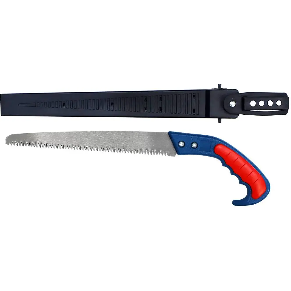 Обрізна ручна ножівка для роботи в саду. Комфортна вигнута рукоятка яка складається з 2-х компонентів і не ковзає в руках. Якісне лезо виготовлено з вуглецевої інструментальної загартованої сталі. Товщина леза дозволяє витримувати важкі навантаження. 3D заточка зубів та 6TPI забезпечують чітке і рівне спилювання товстих гілок. Призначена для робіт з деревом твердих та м'яких порід. Ножівка має вушко для ремінця, завдяки чому її можна тримати в підвісному вигляді, що забезпечує компактне і акуратне зберігання. Пластиковий чохол призначений для безпечного зберігання та транспортування.